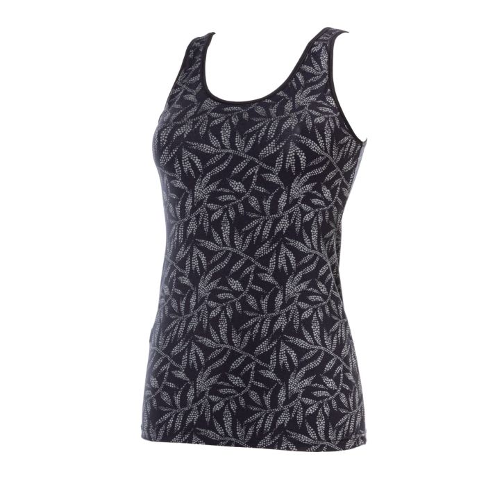 Dit super mooie topje van Avet is niet alleen erg fijn om te dragen op de huid door de fijne micro-vezel, maar is ook zeker een prachtig topje om te laten zien. Het blijft erg mooi in de was en geeft een sjieke uitstraling. Dit is een afgeleide van de bekende dames hemdjes van Avet, de 7591 serie. De ondergrond is zwart met een mooie grijs-groen print van een plant/bladeren. Zie ook het geweldige bijbehorende shortje 38046.